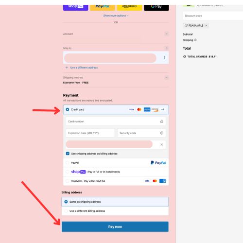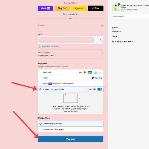 At checkout, under "Payment," click "TrueMed - Pay with HSA/FSA" and click "Pay Now".